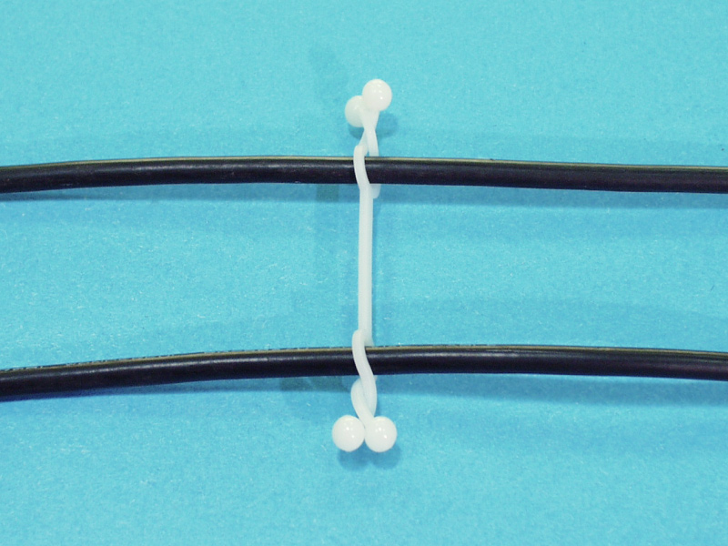Dual in Line Twist Lock / Purse Lock. Max. Bundle dia. Ø8.6mm. Spacing between Bundle 30.0mm. Material Nylon 66. Available in Natural or Black. This Twist Tie keeps defined distance between 2 wires/ cable bundles