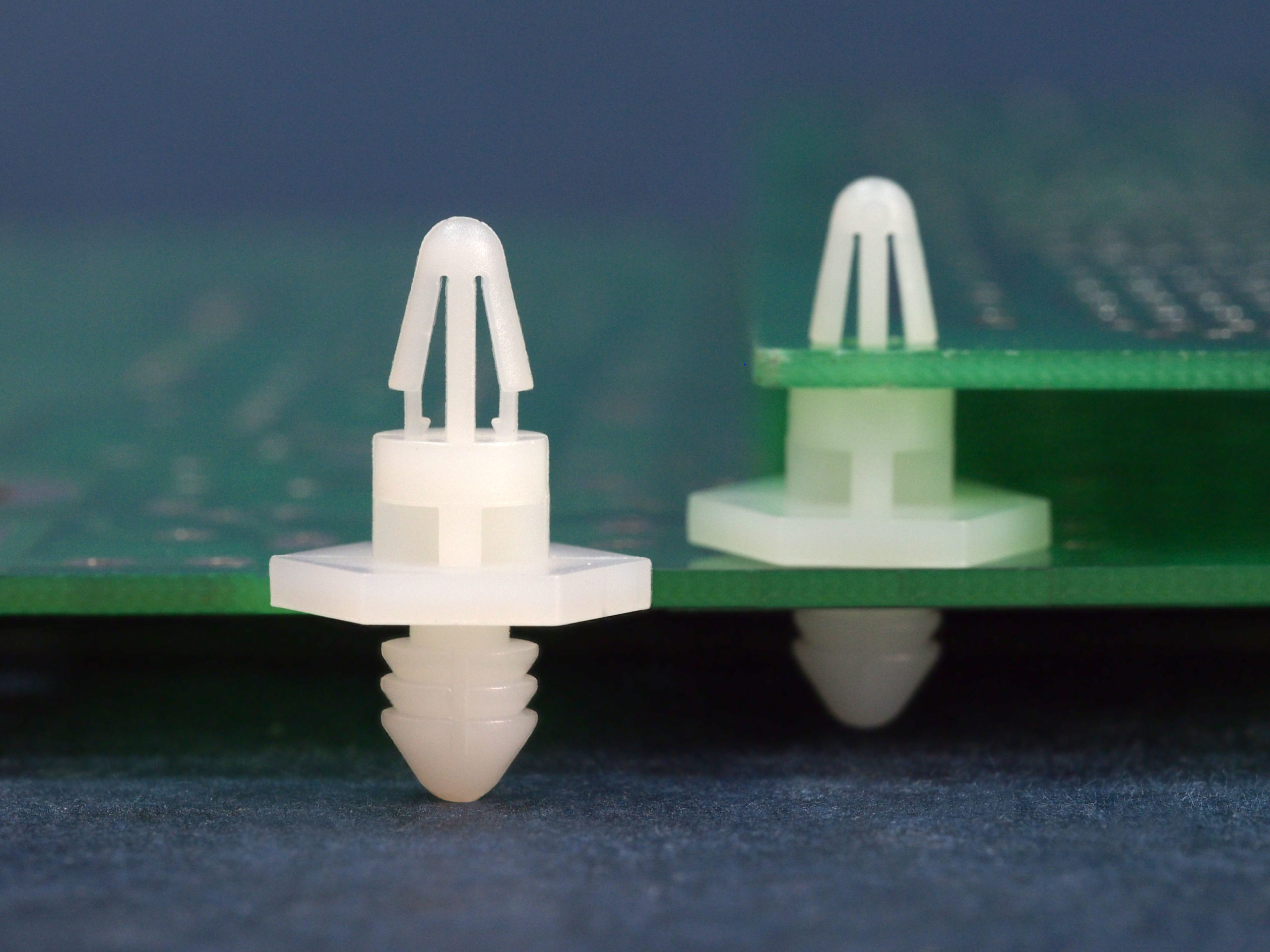 This blind hole circuit board spacer will press-fit into a 6 mm round threaded, punched or drilled holes. The arrowhead fits a 4 mm hole. Spacer length is 6.8 mm.
