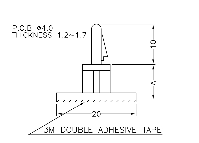Self Adhesive Spacer Snap Lock Bayonet nose. Height 9.0mm. Material Nylon 66. Color Natural/Black. Adhesive backing thickness is 0.9mm