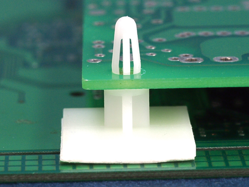 Self Adhesive Spacer Snap Lock Bayonet nose. Height 15.3mm. Material Nylon 66. Color Natural/Black. Adhesive backing thickness is 0.9mm