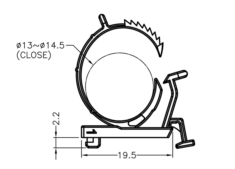 Panel Mount Round Adjustable Lock Wire Clip. Holding dia. Ø13.0-14.5mm. Panel Thickness 0.8-1.0mm. Material Nylon 66. Available in Natural or Black