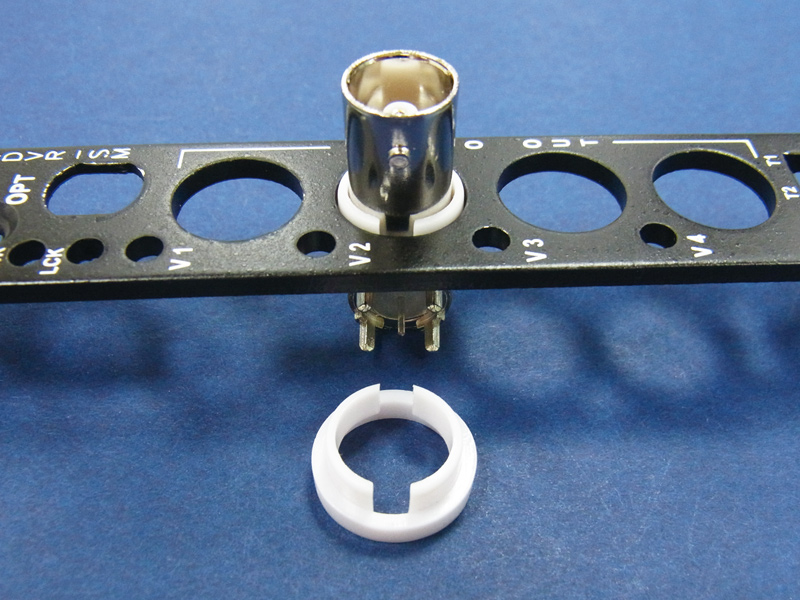 BNC Connector Bushing. Material ABS. Color Natural. Provides electrical isolation between the BNC female coaxial housing and the panel.