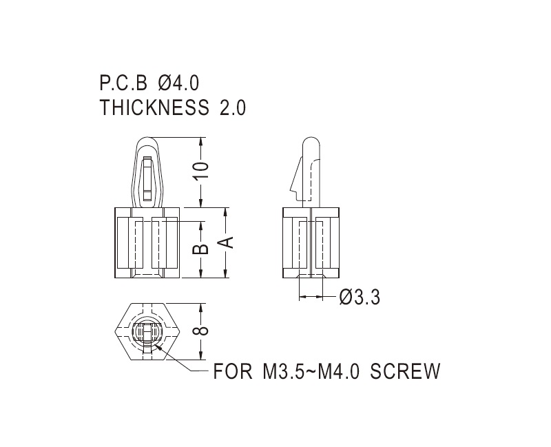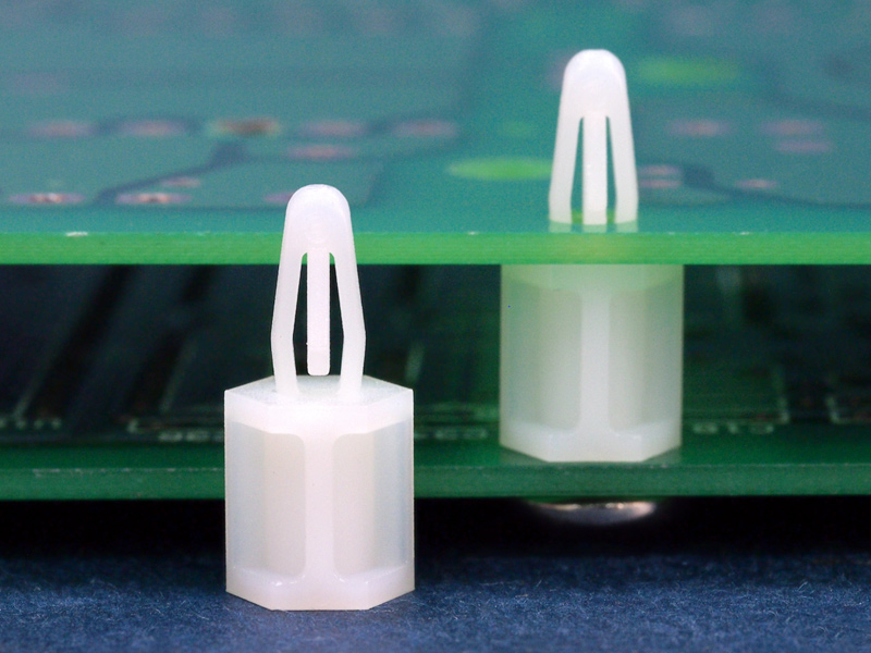 Snap lock hexagonal self tapping spacer with a pilot hole of 2.9 mm and a bayonet snap lock for a 4 mm mounting hole. Standoff height is 10 mm.