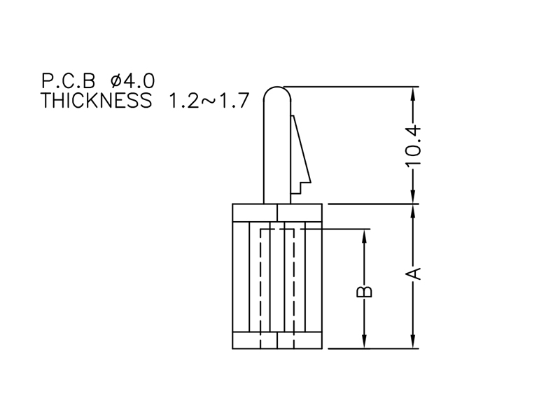 Snap lock hexagonal self tapping spacer with a pilot hole of 2.9 mm and a bayonet snap lock for a 4 mm mounting hole. Standoff height is 14 mm.