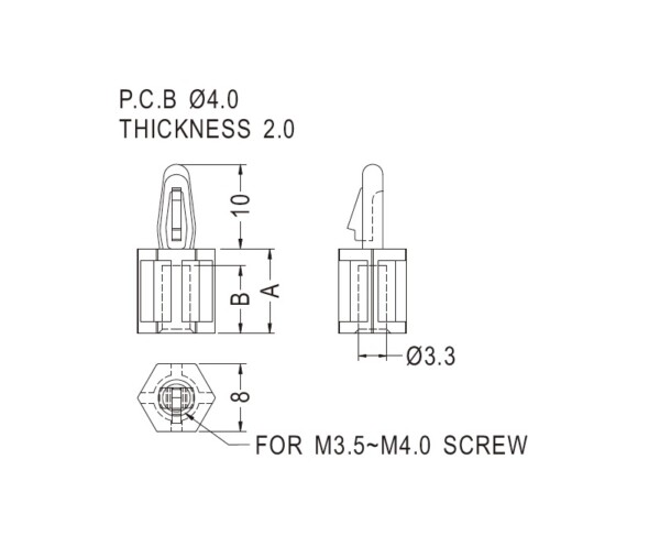 Snap lock hexagonal self tapping spacer with a pilot hole of 2.9 mm and a bayonet snap lock for a 4 mm mounting hole. Spacer length is 20 mm.