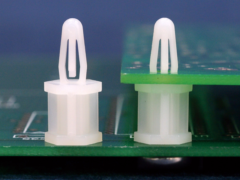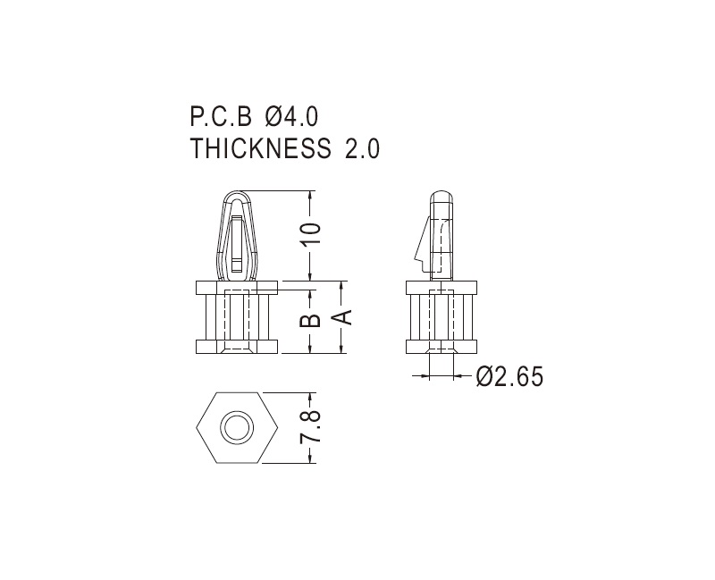 Snap lock hexagonal self tapping spacer with a pilot hole of 2.9 mm and a bayonet snap lock for a 4 mm mounting hole. Standoff height is 8 mm.