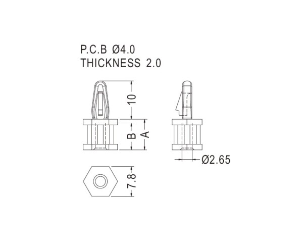 Snap lock hexagonal self tapping spacer with a pilot hole of 2.9 mm and a bayonet snap lock for a 4 mm mounting hole. Spacer length is 8 mm.