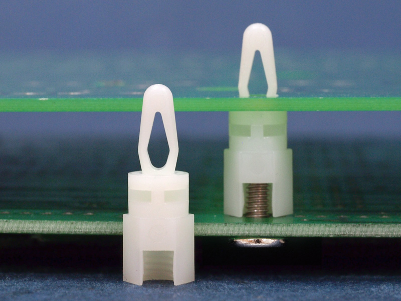 Female 6-32 UNC threaded snap lock PCB support. Snap fit top fits 4 mm panel hole. Standoff height is 12.7 mm.