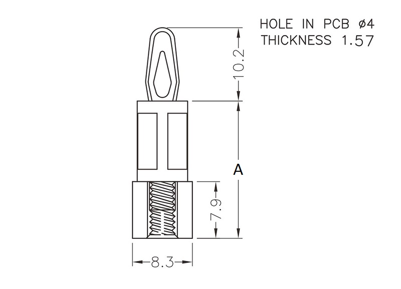 Female 6-32 UNC threaded snap lock PCB support. Snap fit top fits 4 mm panel hole. Spacer length is 25.4 mm.