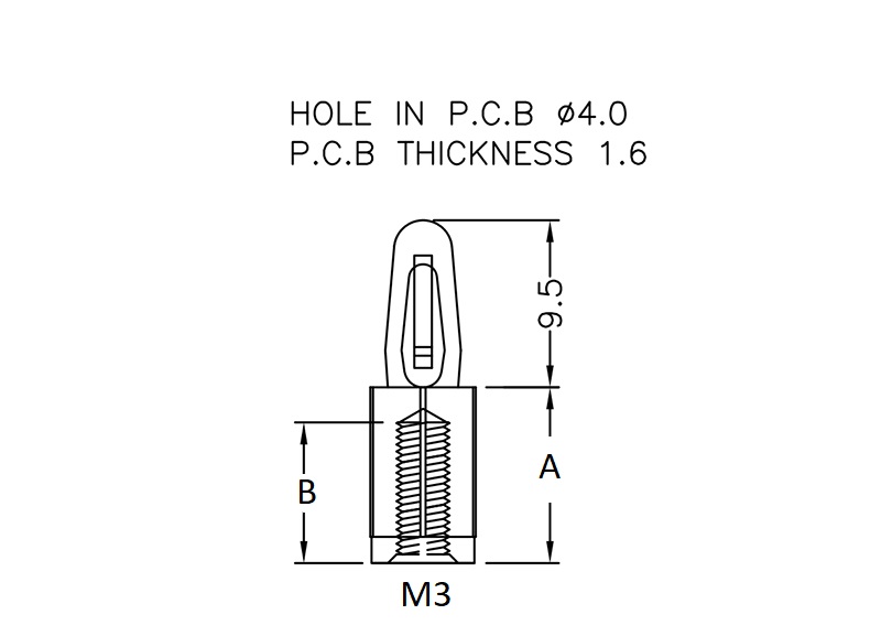 Female M3 hexagonal threaded snap lock PCB support. Bayonet top fits 4 mm panel hole. Standoff height is 12 mm.