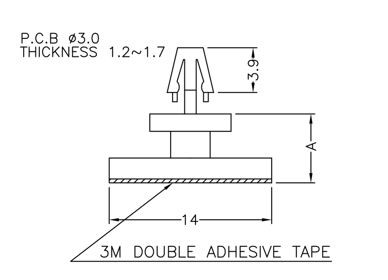 Self Adhesive Spacer Arrowhead Snap Lock. Height 11.9mm. Top Hole dia. Ø 3.0mm. Thickness 1.2-1.7mm. Material Nylon 66. Color Natural/Black.