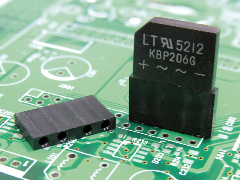 Rectifier Housing 4 Lead. Material PBT. Color Natural/Black. For consistent vertical PCB mounting, these protect the rectifier leads from bending or breaking.