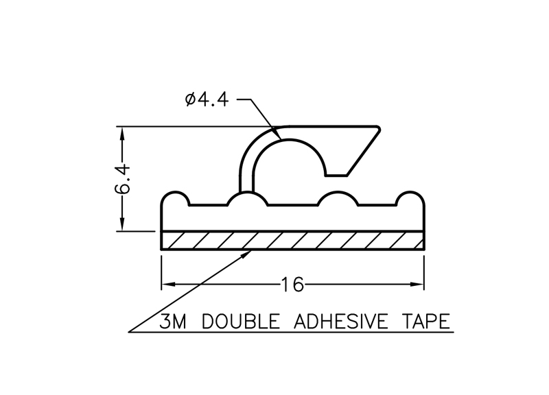 Adhesive Mount 16.0×15.6mm Round Wire Clip Side Entry. Holding dia. Ø4.4mm. Material Nylon 66. Available in Natural or Black
