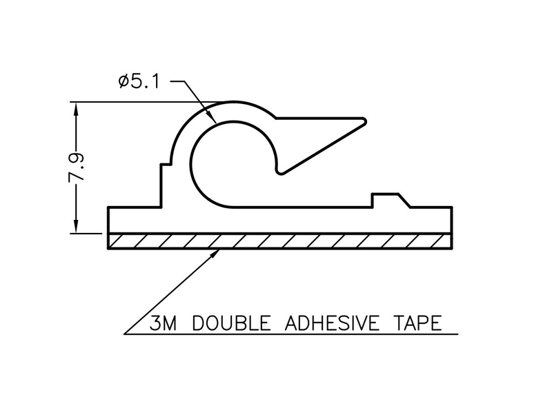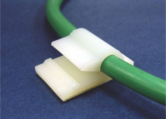 Adhesive Mount 20.7×13.1mm Round Wire Clip Side Entry. Holding dia. Ø5.1mm. Material Nylon 66. Available in Natural or Black