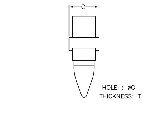 Snap Lock Mount Wire Clip Side Entry Lock. Holding Area (WxH) 10.0×4.8mm. Mounting Hole dia. Ø4.8mm. Chassis Thickness 2.0mm. Material Nylon 66. Available in Natural or Black
