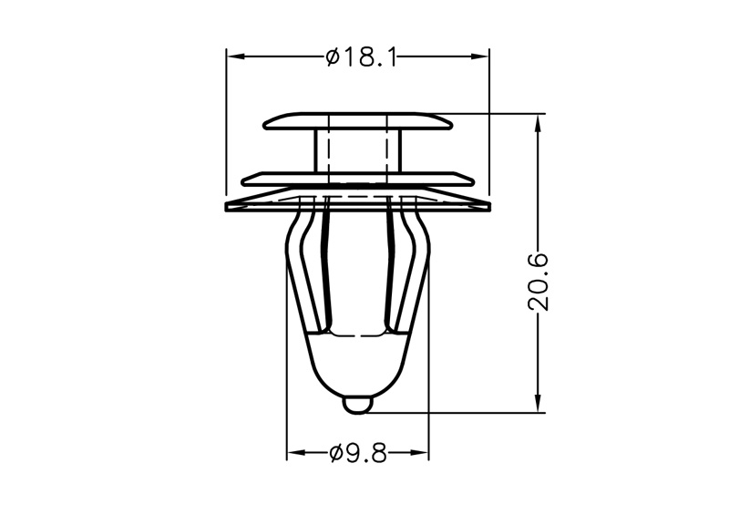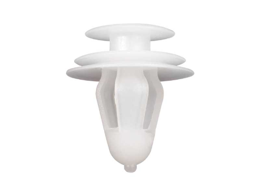 Push In Rivet. Nylon 66. Color Natural/Black. Hole diameter Ø 8.0mm. Panel Thickness 0.8-1.6mm. The grommet expands as the pin is inserted, creating a secure fit. Ideal for applications that require a front-mount rivet.
