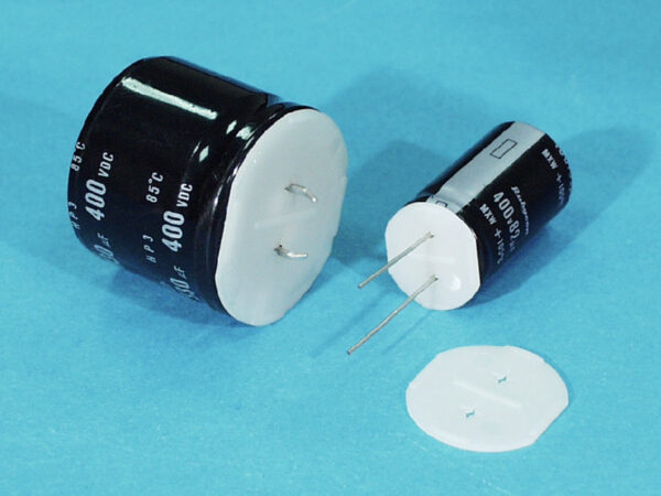 Electrolytic Capacitor Washer. Diameter Ø18.2mm. Height 1.5mm. Material Nylon 66. Color Natural/Black. These washers maintain a uniform, level height after board mounting ensuring optimal conditions for automatic soldering.