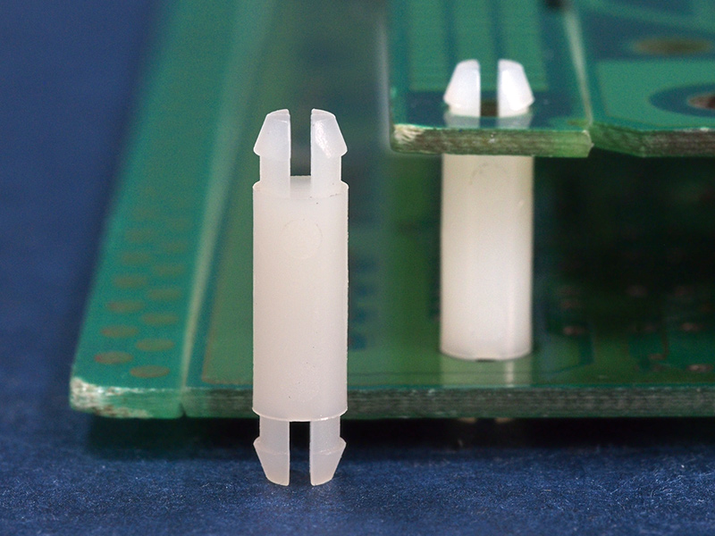 This spacer fits a panel top and bottom hole of 4 mm with a two prong snap lock. Standoff height is 6.4 mm.