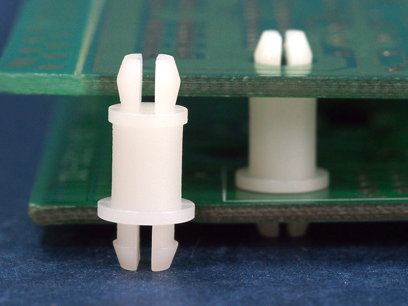Spacer with additional support fits a panel top hole of 4 mm with a two prong snap fit and a bottom hole panel of 4 mm with a two prong snap lock. Standoff height is 17.5 mm.