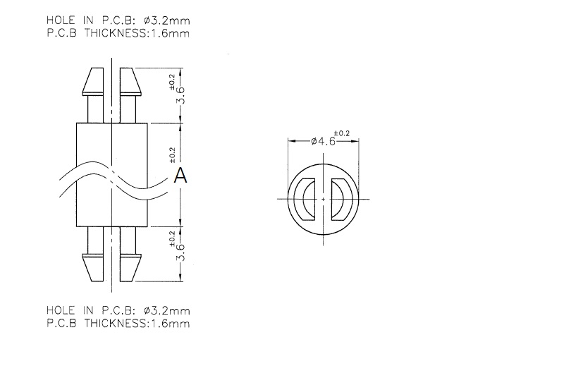 Dual snap lock support. A locking two prong snaps in a 3.2 mm top and bottom panel hole. Standoff height is 28.6 mm.