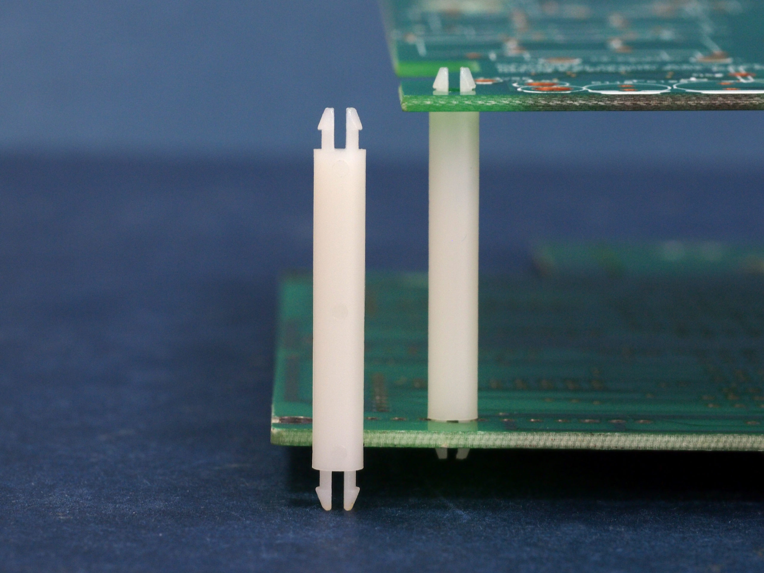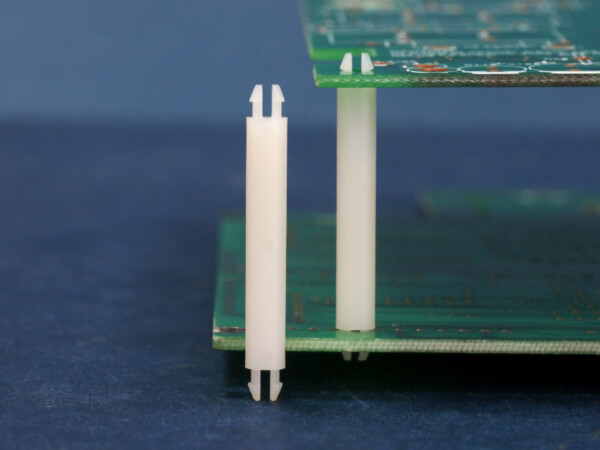 Dual snap lock support. A locking two prong snaps in a 3.2 mm top and bottom panel hole. Spacer length is 28.6 mm.