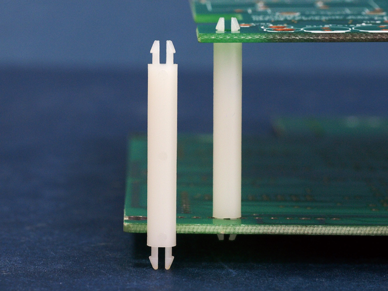 Dual snap lock support. A locking two prong snaps in a 3.2 mm top and bottom panel hole. Standoff height is 38.1 mm.