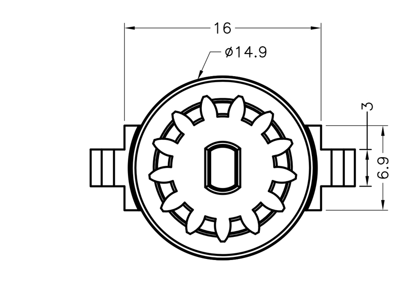 Clip Design Rotary Damper. Body diameter 16.0mm. Mounting slot pitch: 19.7mm. 13 Gear Teeth. Color Coded tailored versions with a different torque are available. UL 94HB ABS Housing. Gear Material POM.