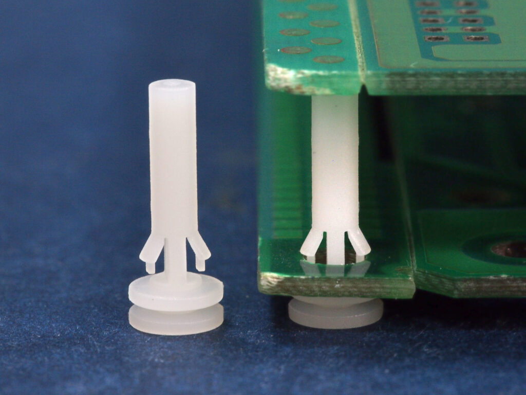 Reverse mount PCB spacer. Design minimizes protrusion on chassis bottom. Flat rest prevents PCB from bending. Snap in fixation in chassis hole diameter of 3.5 mm. Spacer length 15 mm.