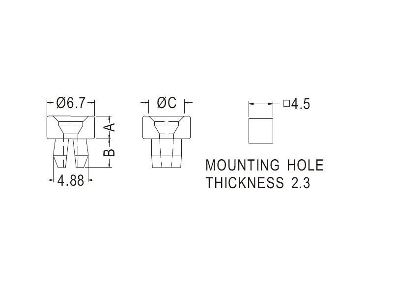 This spacer nut fits into a squared panel hole of 4.5 x 4.5 mm and expands when a self-tapping crew of 2.9 mm is installed. Standoff height is 3.2 mm.