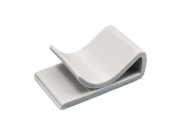 Adhesive Flat Ribbon Cable Clip. Base 25.4x15mm. Height 9.3mm PVC. Color Gray. Spring loaded to hold cable firmly in position.