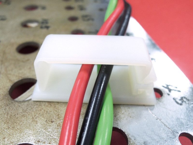Blind Hole Mount Lock Hinged Flat Cable Lock Clamp (WxH) 45.4×15.2mm. Cable Width 31.8mm. Mounting Hole dia 6.5-7.0mm. Max. Chassis Thickness 0.8-3.0mm. Nylon 66. Available in Natural or Black.