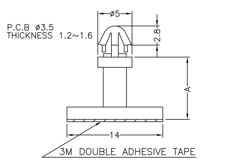 Self Adhesive Spacer Arrowhead Snap Lock. Height 9.2mm. Top Hole dia. Ø 3.5mm. Thickness 1.2-1.6mm. Material Nylon 66. Color Natural/Black.