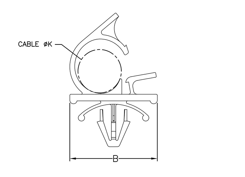 Snap Lock Round Cable Clamp with Locking. Nylon 66. Bundle Size Ø9.5mm. Mounting hole Ø6.5-7.0mm. Chassis Thickness 0.6-2.7mm. Available in Natural,Black or Gray