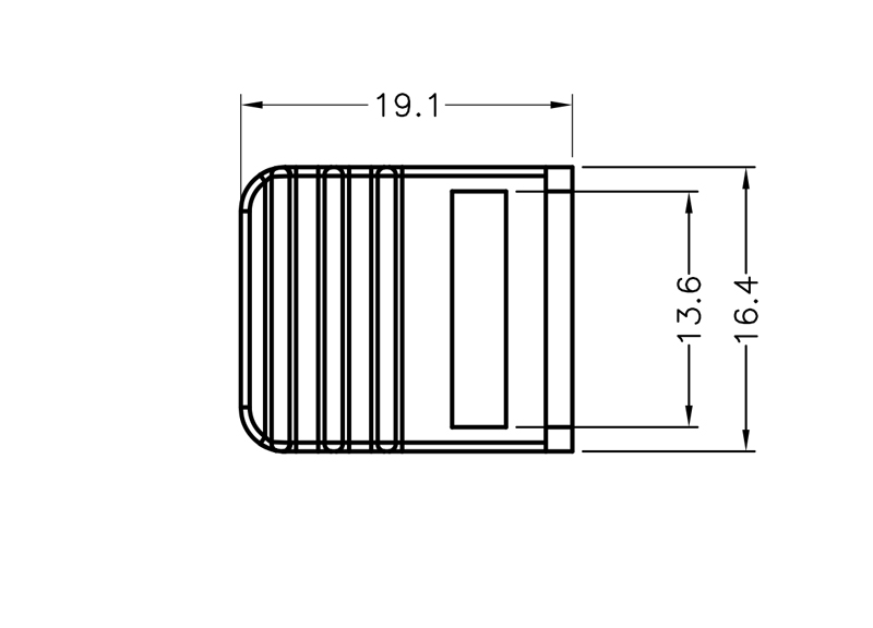 End cap for lever mechanism release handle. Material Black Polycarbonate + ABS. For Latchsize (WxH) 13.6×1.8mm