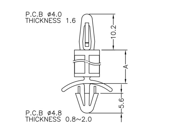 Dual locking support post. Bayonet snap fit for top hole of 4 mm and arrowhead with tension wing for 4.8 mm chassis hole. Spacer length is 15.9 mm.