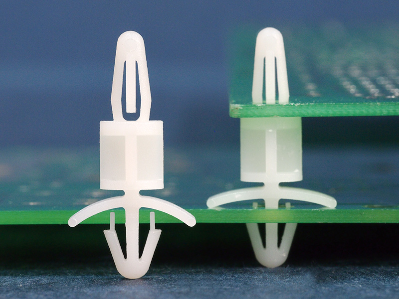 Dual locking support post. Bayonet snap fit for top hole of 4 mm and arrowhead with tension wing for 4.8 mm chassis hole. Standoff height is 9.5 mm.