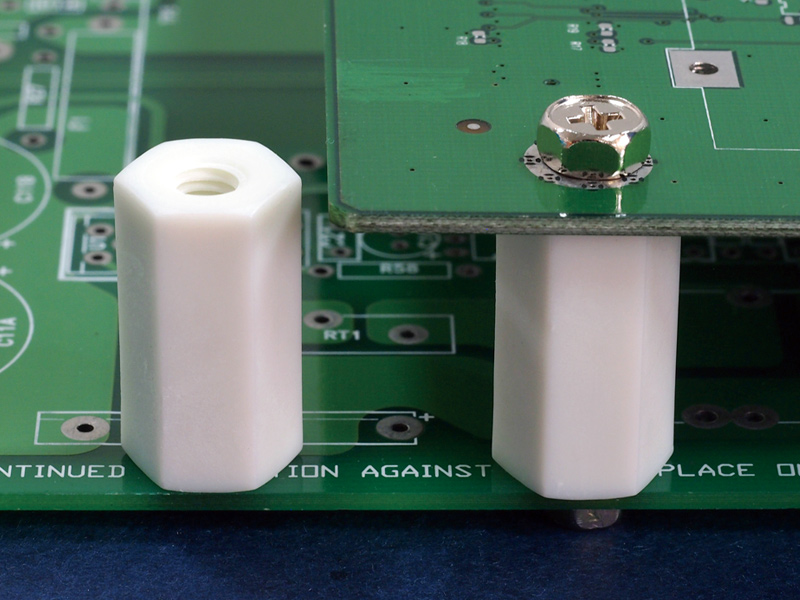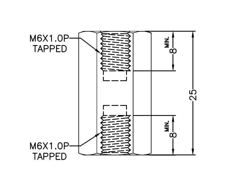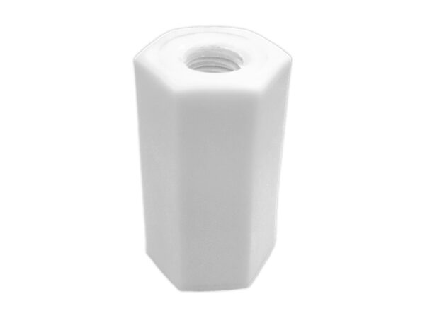 Metric tapped hex Nylon 66 spacer, female/female, M6 threads on both ends with 8 mm thread depth per end. Standoff height is 25 mm.