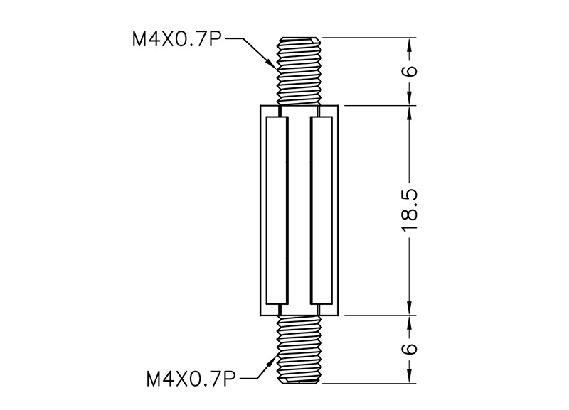 Metric tapped hex Nylon 66 spacer, male/male with a M4 metric external 6mm thread on both ends. Standoff height is 18.5,0mm