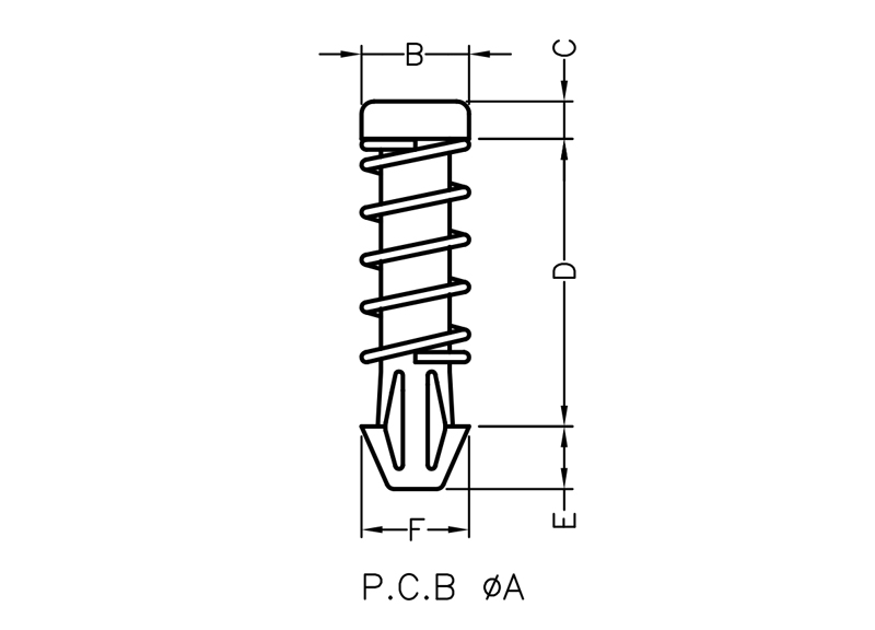 Push Heatsink Clip with spring for PCB Ø 3.0mm ( suggests Heat Sink Hole Dia. 3.2mm) Length 8.3mm. Material Nylon 66. Color Natural or Black. Please contact us for tailored spring force options.