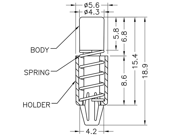 Push Heatsink Clip with spring for PCB Ø 3.0mm ( suggests Heat Sink Hole Dia. 3.2mm) Length 9.6mm. Material Nylon 66. Color Natural or Black. Please contact us for tailored spring force options.