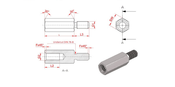 Male/Female Hexagonal Aluminum Standoff M4 Thread with undercut