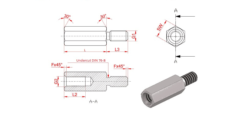 Male/Female Hexagonal Stainless Steel (Inox) Standoff M5 Thread with undercut