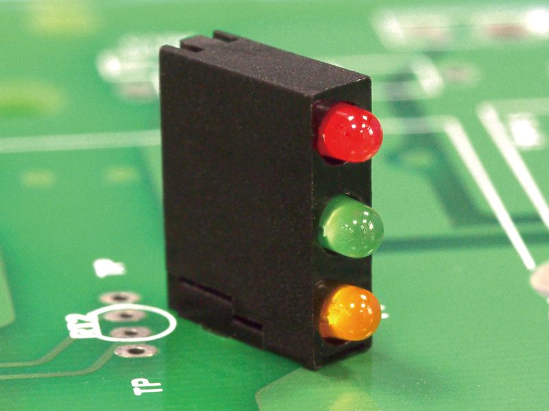 Right Angled 3 stack LED holder for LED size 3mm(T-1). Centerline bottom LED 2.5mm. Distance between LED’s 5.08mm. LED’s shown for Demo not included in holder