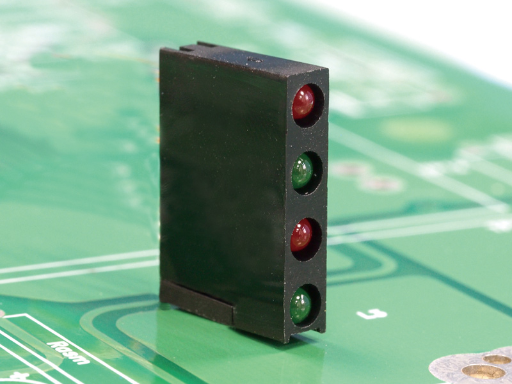 Right Angled 4 stack LED holder for LED size 3mm(T-1). Centerline bottom LED 2.54mm. Distance between LED’s 3.81mm. LED’s shown for Demo not included in holder