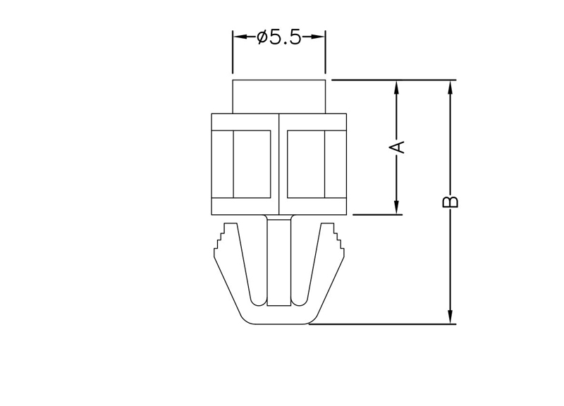 Snap lock M3 spacer with arrowhead for a mounting hole of 5.5 x 7.1 mm. Standoff height is 5 mm.