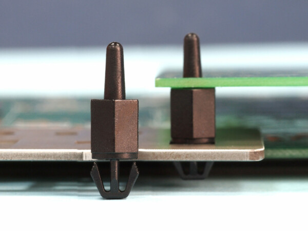 Snap lock with friction pin for easy assembly. Fits a mounting hole of 5.5 x 7.1 mm. Spacer length is 10 mm.