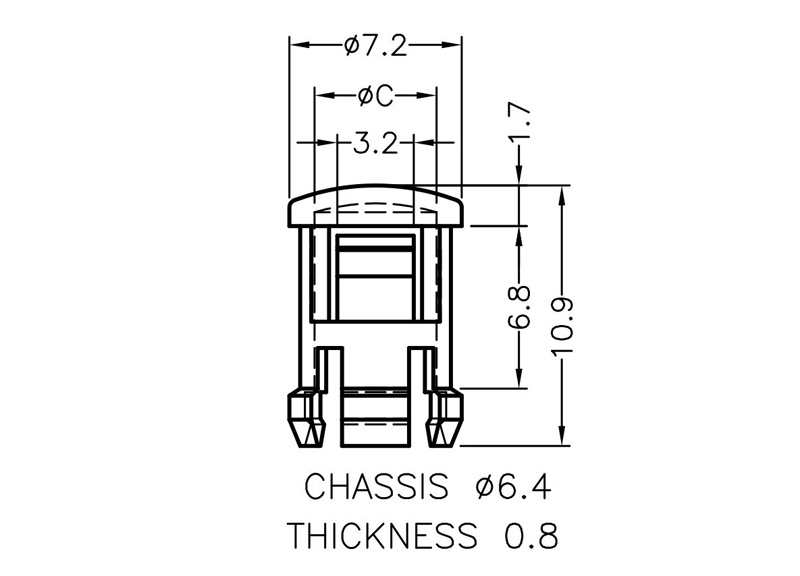 Snap-In Fresnel Lens Cap for 5mm LED. Transparent Polycarbonate. Mounting hole Ø 6.4mm. Panel Thickness 0.8mm