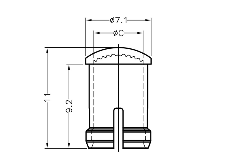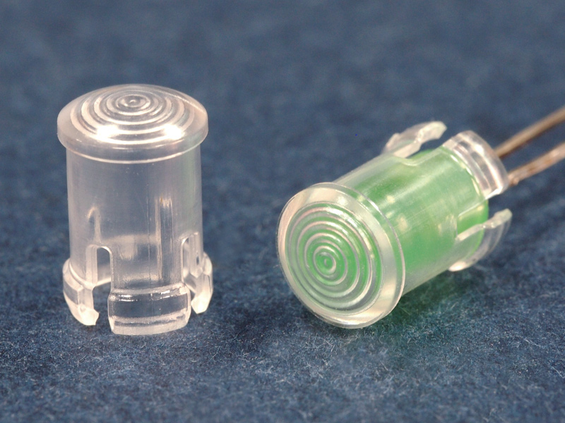 Snap-In Fresnel Lens Cap for 5mm LED. Transparent Polycarbonate. Mounting hole Ø 6.4-6.45mm. Panel Thickness 0.8-6.35mm