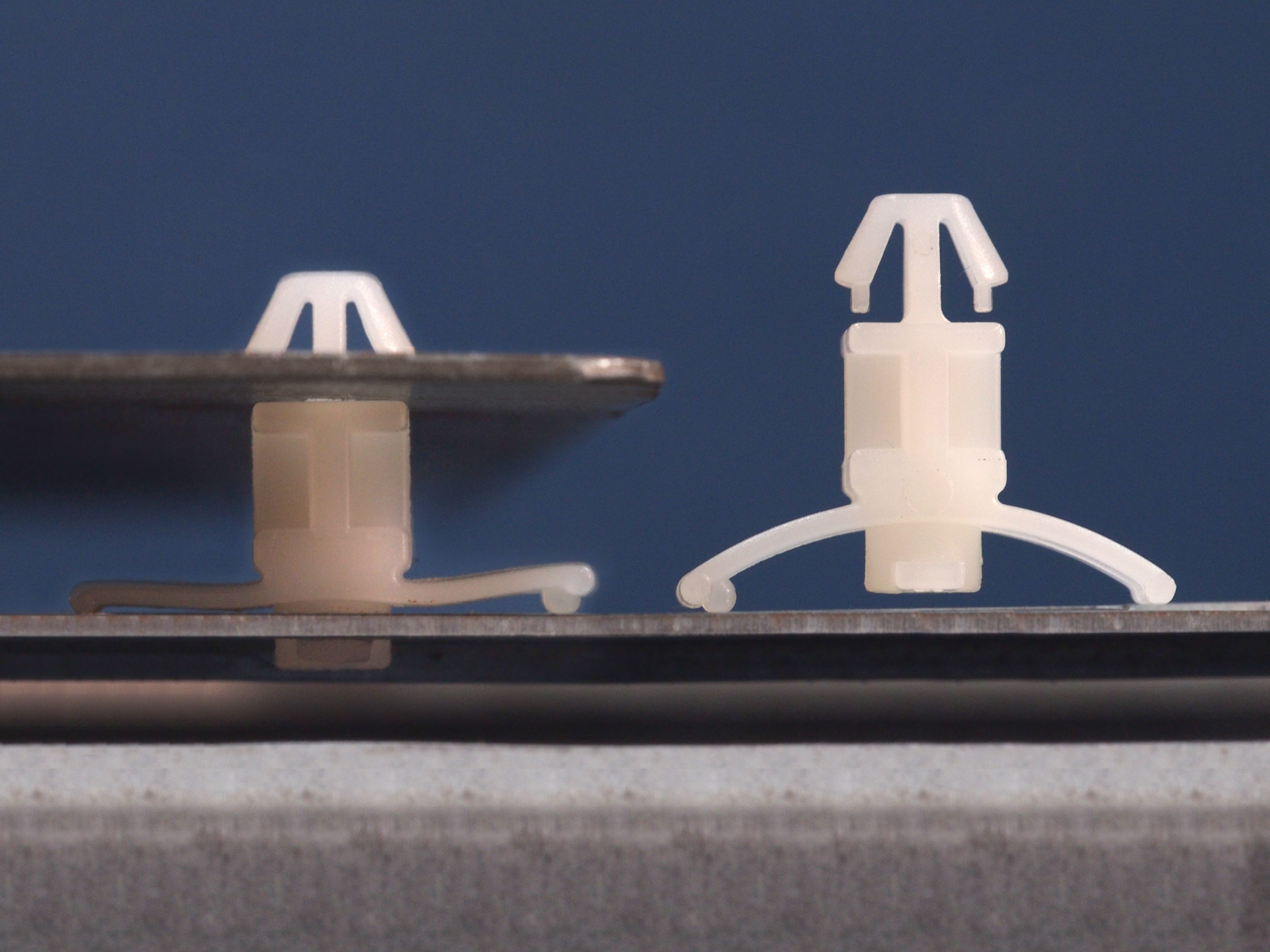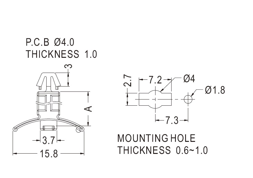 Dual locking support post. Arrowhead top for 4 mm panel hole and slide lock with anti rotation tension wing for 4 mm chassis hole. Spacer length is 7.6 mm.