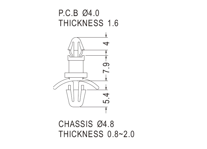 Dual locking support post. Arrowhead top for 4 mm panel hole and arrowhead with tension wing for 4.8 mm chassis hole. Spacer length is 7.9 mm.
